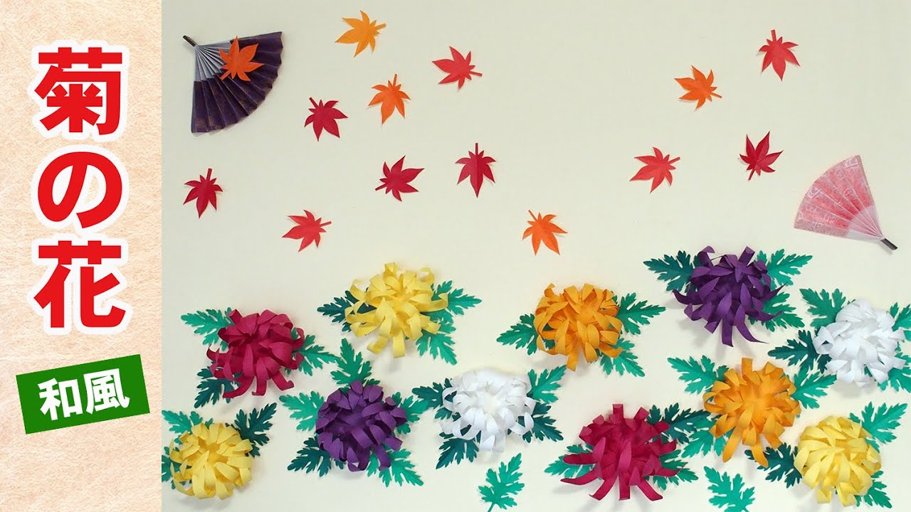タイトル | 【秋の壁面飾り】折り紙で簡単クラフト 菊の花・もみじ・扇の秋工作 |